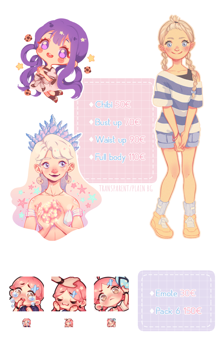 ✦ Please, read carefully before asking for a commission.✦ These commissions are for personal use only, email me for commercial enquiries.✦ Only Paypal (fee not included in the price).✦ Must be paid up-front.✦ No refunds.✦ Props, pets or complicated designs may cost extra.✦ Do not rush me, take into account I can take up to 2 months for a commission after payment.✦ Payment must be sent in euros.✦ This is not first come first serve, I will pick the commissions I prefer to draw, please don’t feel bad if yours isn’t picked now, it doesn’t mean I don’t like your character!✦ OCs and fanart are OK!✦ I prefer to draw girls, but feel free to send your form for other type of characters too.✦ Please take into account that me taking commissions doesn’t mean I will put 100% of my time into them, I might draw other things, game or read in my free time.✦ I may include your piece in my portfolio or an artbook, let me know beforehand if that would upset you. I may stream parts of the process of your commission on my Twitch channel but you can opt-out of this by paying a 10% fee..